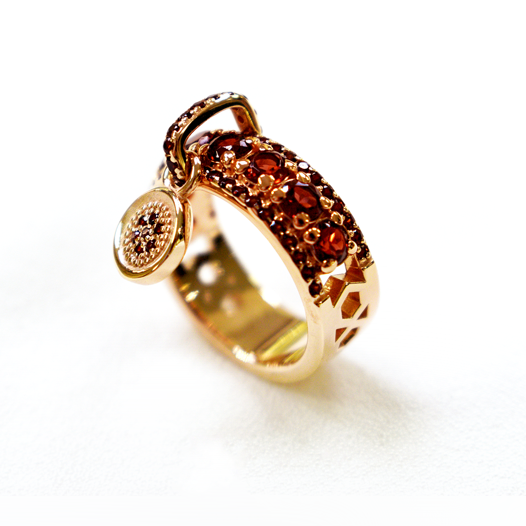 Акцентное кольцо с круглым медальоном, украшенное драгоценным гранатом. Дорожка из драгоценных камней выполнена только на лицевой части изделия, чтобы камни не царапали кожу.