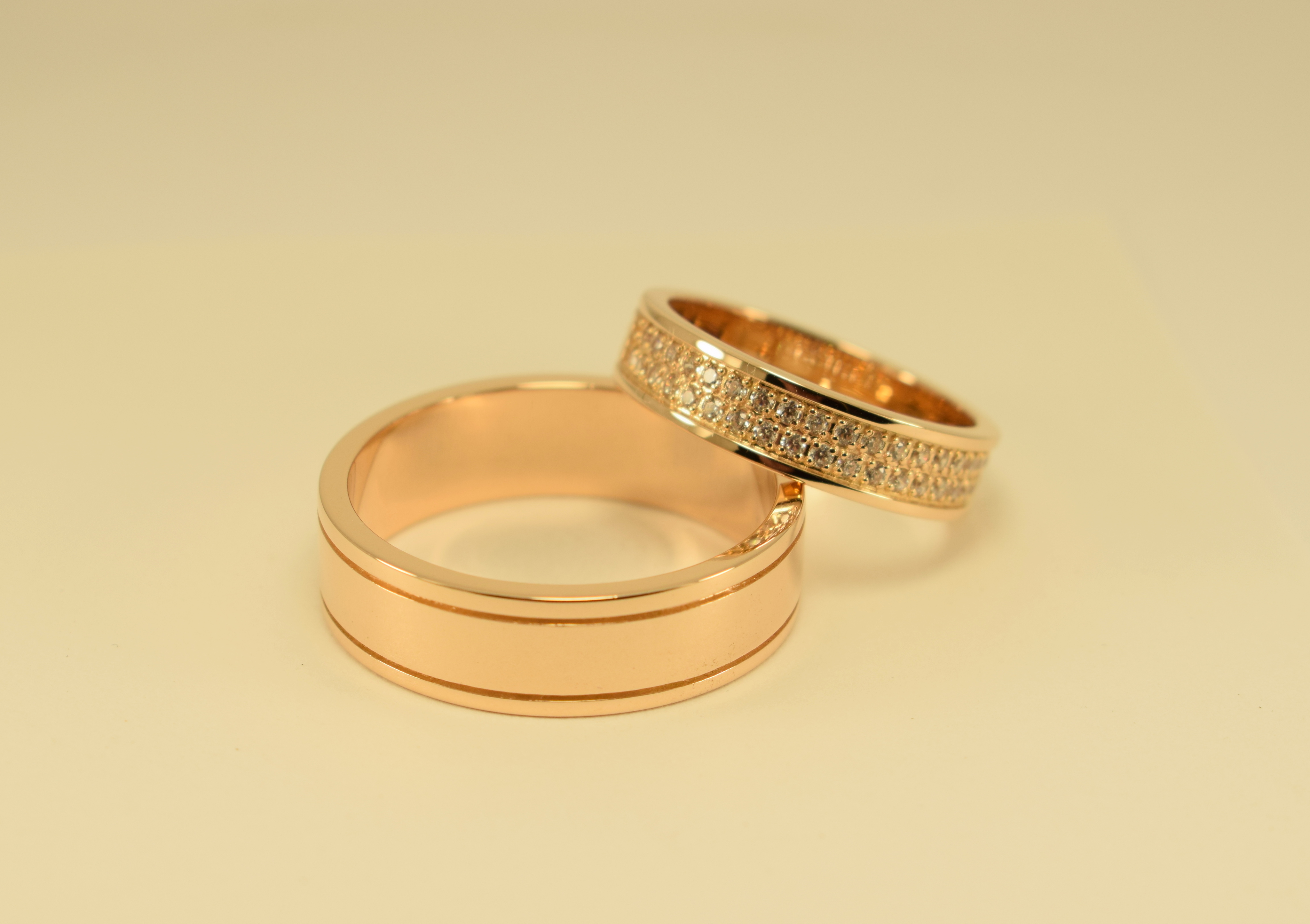 В данной паре мужское кольцо - лаконичность женское кольцо- блеск!