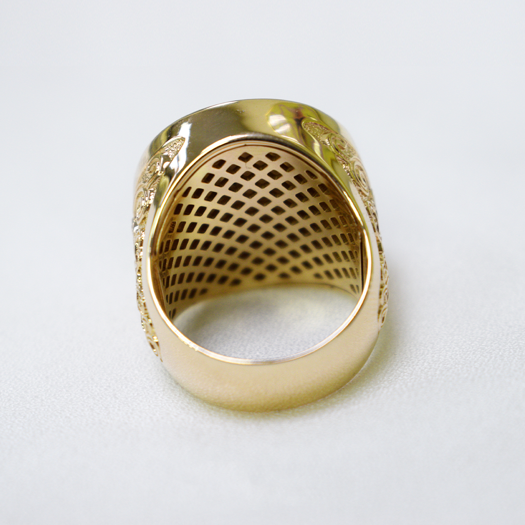 Основной элемент печатки — объемная площадка с зубчатым краем и углублением с вставкой из белого золота. Посадка комфорт (сетка внутри кольца) позволяет ежедневно носить объемное украшение без дискомфорта для кожи и пальцев.
