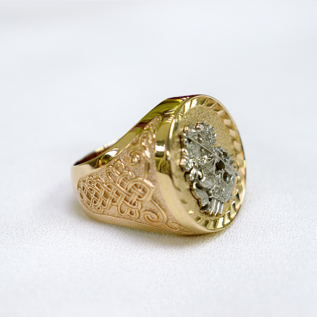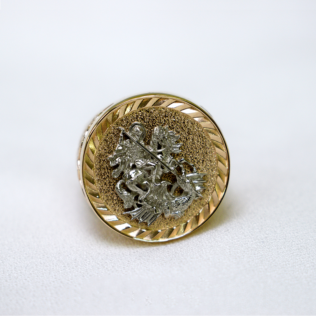 На печатке в белом золоте изображен классический сюжет, где Георгий Победоносец поражает змея острием своего копья.