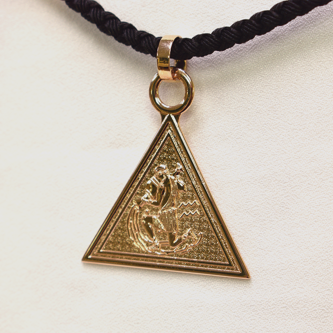 На лицевой стороне изображен фактурный глаз с сапфиром вместо зрачка, на обороте фигура зодиакального знака Водолей.